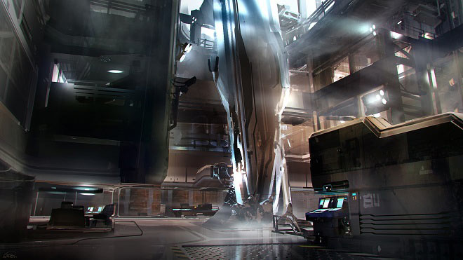 We have numerous talented artists within the studio, one of them being Nicolas Bouvier. Also known as Sparth, Nicolas has been an active artistic director and concept designer in the gaming industry since 1996. One of his greatest passions is contemporary and futuristic architecture, of which he applies principles in his own art and photography. He has contributed to the development of several released games since 1997, including Alone in the Dark 4 (2001), Cold Fear (2005), Prince of Persia - Warrior Within (2004), Assassin's Creed (2007) and Rage (2011). He joined 343 Industries in 2009, and below is a small snapshot of the work he did for Halo 4. Accompanying each piece of concept art is a description, penned by Sparth himself. Complex multiplayer map interior: This is one of the interiors we designed for the multiplayer level named "Complex", a map Derrick Hammond was taking care of with his team. "Complex" is mostly an exterior map, but you still have several areas like in the main building where you will find moodier atmospheres with less direct natural light. This concept was done for the main room where the UNSC has been studying a large Forerunner monolith, very reminiscent of the Atrium monolith from the campaign "Composer" mission, but in smaller proportions. The image clearly shows a lot of opening, suggesting multiple levels, so we had to definitely simplify a lot of it once it was modeled. The final 3D result is having more vertical walls without the opening you see in the concepts, but the atmosphere and general detailing remained the same. Requiem crater crash site: We actually did several versions of the crash site. Happening in the "Requiem" mission, it takes place on the Requiem planet, when the Forward unto Dawn crashes on its surface. We especially wanted to insist on the overhanging piece of structure you see in the concept, and this in order to emphasize the epic and impressive aspect of the level, as well as reinforce the feeling of danger [and] of having something massive above the Master Chief's head, something ready to fall and crash on the ground. Infinity interior: One of the first Infinity spaceship interiors, probably the very first one we finished. We knew the ship was going to be having gigantic proportions, so it gave us quite some freedom to work on large interiors. This concept was initially started by Jihoon Kim, [from whom I] managed to obtain a good base to work. I then brought the image to another level of detail by spending quite some time describing the aesthetics and architecture, which is mostly what I would call "military tech", a term describing best the UNSC visuals when it comes to design shapes and rhythms. Composer: A concept for the atrium area within the space station. The central monolith went through several iterations before finding the right one. On this concept, it looked a bit more cathedralesque, but not "Forerunner" enough. The initial idea that remained was that this piece of architecture was so deeply rooted into the planet's ground that they had to remove a large chunk of the planet's surface to remove it. Composer: The docking area of the space station was initially called the "horseshoe" by the 3D team because of its "U" shape from above. It consists of a super extended space opening with a horizontal crane on top. The piece was supposed to be mostly inspirational at first, meaning that a lot of the gameplay areas weren't supposed to show but Adam Peterson and Paul Ehreth managed to magically integrate a lot of the original concept in the final layout. As a result, the 2D concept and 3D final product are sometimes very similar. We hope you enjoyed this teeny tiny peek behind the curtain of the development of Halo 4. Many thanks to Sparth, both for sharing his work and providing insight into his concepts. Stay tuned for more art spotlights in the future!