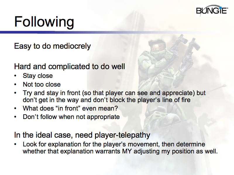 first | previous | next | last  Larger version Notes: Is the player traveling somewhere, or is he/she just leaving the the battle front for a few seconds to look for ammo? Is the room he/she is entering a path to somewhere else or a dead-end? In Halo2, you needed to get quite far away from your collected allies before they registered that you were moving, so they always seemed lazy or slow. Whereas they really could have used a sense of "we're finished in this area, and the only explanation for the players movement in that direction is that he's moving on to the next area"