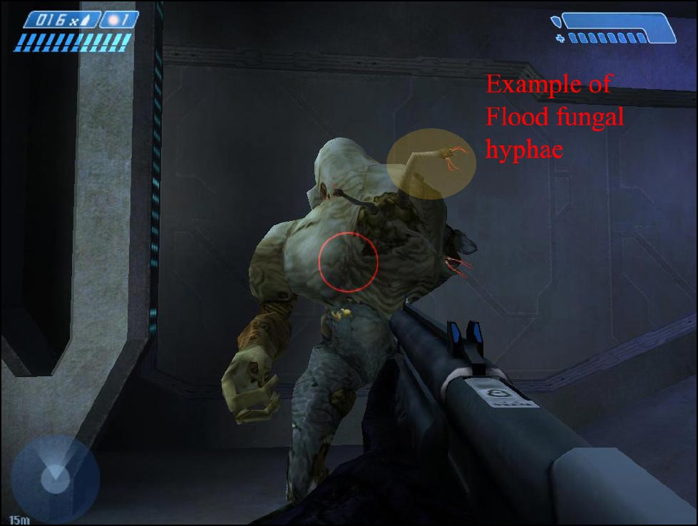 By: Joshua Moskowitz (jman571)Also available as a downloadable PDF (421K) Preface:I've been a fan of the Halo series and Bungie Studios quite some time now, and yet, I've never really contributed anything unique to the community. I frequent HBO, and after "discovering" the Halo Story Page, I've come to cherish the regular updates that Jillybean, Finn, and mnemesis have contributed to it. So naturally I've come to the point where I've decided to combine two of my passions: science and Halo, and create something for the benefit of the community and for myself. I'm currently in Grade 11, and in particular my AP Biology class has given me the knowledge I needed to write this report. The Taxonomical classification system, which originated with Aristotle, is a ways to sort between different organisms based on their biology. I hope to classify the Flood organism, and perhaps offer insights into the purpose of this creature, its relationship with the Forerunner, and what its significance is in the context of the Halo universe. This paper is written in an informal lab report style, and any original ideas expressed here are merely speculation and pending confirmation from Bungie, cannot be confirmed. Table of ContentsPurpose Purpose:Classify the Flood organism into one of the 6 taxonomic Kingdoms through canonical and theoretical knowledge of the organism, and then using this information; infer the purpose and history of the Flood in the context of the Halo universe. Hypothesis:The Flood organism belongs to the Kingdom Fungi, and is in the phylum/division of Imperfect Fungi (Deuteromycota). The Flood organism begins life as a fungal conidiospore, and progresses in asexual reproduction into a colony, producing a Ranger/Infection form of the Flood organism in order to take over host bodies. Observations:Although the amount of information on the Flood is not nearly enough to present a conclusive case, I have found game play, cutscene, and empirical data to further my hypothesis and hopefully shed some light on the origins of this species. To begin, you need to first understand what constitutes an organism that belongs to the Kingdom Fungi. This kingdom is Eukaryotic (compartmentalized organelles, mostly multi-cellular, true nucleus) and use cell walls made of the protein 'chitin' in order to maintain their integrity and strength. All fungi are composed of threadlike filaments called hyphae and as filaments grow they become tangled and form a mass of filaments called mycelium. Fungi are heterotrophic (meaning they can't produce their own food and need organic materials instead) and can either be categorized as saprophytes or parasites. However for the duration of this report the Flood organism will be categorized as a parasitic fungus. Two main characteristics of a parasite are that they feed on host cells, and they have specialized hyphae that can penetrate host cells without killing them. Finally, fungi reproduce either by means of sexual or asexual reproduction, but in this case, the Imperfect Fungi division is only known to reproduce asexually, and have thus been chosen as best reflecting the Flood life cycle. Before starting this paper I had seriously considered another category unto which the Flood organism might belong, the Kingdom Bacteria. Bacteria feature many of the same traits that I was looking for in a Flood organism; most promising however, was the dormant state endospore production that most bacteria use in unfavorable conditions. Endospores are very hard to eradicate, and even temperatures of 100°C (boiling point) do not ensure eradication of the spores. Sterilization is needed to totally rid of these spores, generally either temperature over 120°C, or extremely high levels of pressure or radiation. The most likely candidate among the bacteria types would be chemoheterotrophs (meaning they use organic molecules as an energy source, as well as a carbon source). However, due to the size of the Flood organisms, and their base intelligence, bacteria could be ruled out as they are too simple a life form to evolve into something resembling the Flood species.