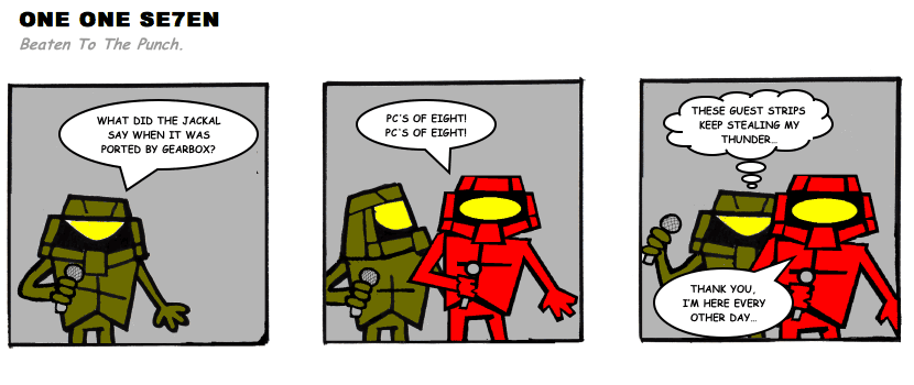 On April 30, 2003, Stuntmutt began turning in episodes of a new comic known as One One Se7en. We'll present them here, in the order in which they were submitted, as they come in. New submissions were added Monday, Wednesday, and Friday. On March 3, 2008, One One Se7en was retired from regular releases - Stunt's life got a tad too busy for 3 strips per week. (He still comes by with new content when the situation arises, however.)