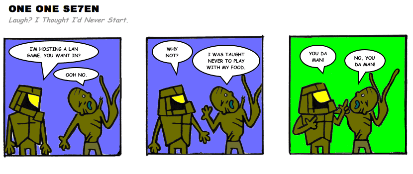 On April 30, 2003, Stuntmutt began turning in episodes of a new comic known as One One Se7en. We'll present them here, in the order in which they were submitted, as they come in. New submissions were added Monday, Wednesday, and Friday. On March 3, 2008, One One Se7en was retired from regular releases - Stunt's life got a tad too busy for 3 strips per week. (He still comes by with new content when the situation arises, however.)
