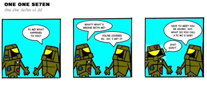 On April 30, 2003, Stuntmutt began turning in episodes of a new comic known as One One Se7en. We'll present them here, in the order in which they were submitted, as they come in. New submissions were added Monday, Wednesday, and Friday. On March 3, 2008, One One Se7en was retired from regular releases - Stunt's life got a tad too busy for 3 strips per week. (He still comes by with new content when the situation arises, however.)