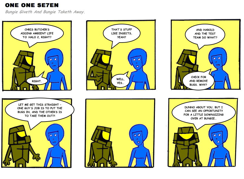 On April 30, 2003, Stuntmutt began turning in episodes of a new comic known as One One Se7en. We'll present them here, in the order in which they were submitted, as they come in. New submissions were added Monday, Wednesday, and Friday. On March 3, 2008, One One Se7en was retired from regular releases - Stunt's life got a tad too busy for 3 strips per week. (He still comes by with new content when the situation arises, however.)