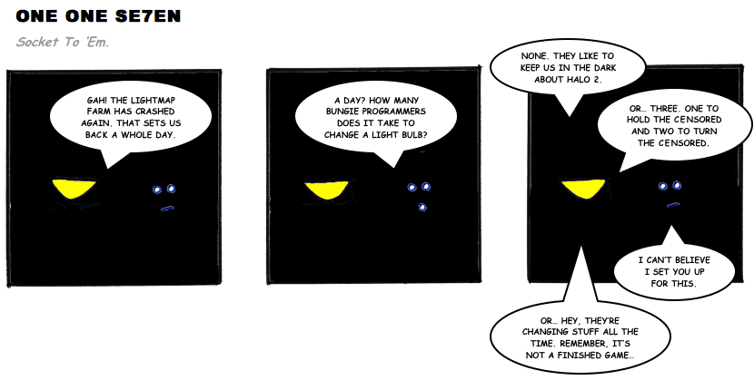 On April 30, 2003, Stuntmutt began turning in episodes of a new comic known as One One Se7en. We'll present them here, in the order in which they were submitted, as they come in. New submissions were added Monday, Wednesday, and Friday. On March 3, 2008, One One Se7en was retired from regular releases - Stunt's life got a tad too busy for 3 strips per week. (He still comes by with new content when the situation arises, however.)