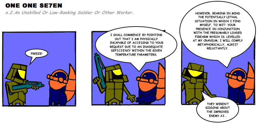 On April 30, 2003, Stuntmutt began turning in episodes of a new comic known as One One Se7en. We'll present them here, in the order in which they were submitted, as they come in. New submissions were added Monday, Wednesday, and Friday. On March 3, 2008, One One Se7en was retired from regular releases - Stunt's life got a tad too busy for 3 strips per week. (He still comes by with new content when the situation arises, however.)