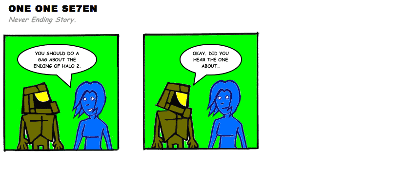 On April 30, 2003, Stuntmutt began turning in episodes of a new comic known as One One Se7en. We'll present them here, in the order in which they were submitted, as they come in. New submissions were added Monday, Wednesday, and Friday. On March 3, 2008, One One Se7en was retired from regular releases - Stunt's life got a tad too busy for 3 strips per week. (He still comes by with new content when the situation arises, however.)