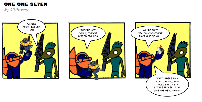 On April 30, 2003, Stuntmutt began turning in episodes of a new comic known as One One Se7en. We'll present them here, in the order in which they were submitted, as they come in. New submissions were added Monday, Wednesday, and Friday. On March 3, 2008, One One Se7en was retired from regular releases - Stunt's life got a tad too busy for 3 strips per week. (He still comes by with new content when the situation arises, however.)