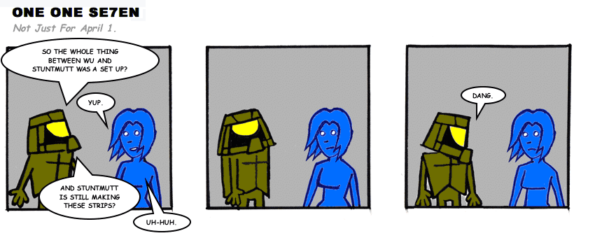On April 30, 2003, Stuntmutt began turning in episodes of a new comic known as One One Se7en. We'll present them here, in the order in which they were submitted, as they come in. New submissions were added Monday, Wednesday, and Friday. On March 3, 2008, One One Se7en was retired from regular releases - Stunt's life got a tad too busy for 3 strips per week. (He still comes by with new content when the situation arises, however.)
