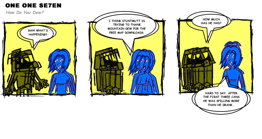On April 30, 2003, Stuntmutt began turning in episodes of a new comic known as One One Se7en. We'll present them here, in the order in which they were submitted, as they come in. New submissions were added Monday, Wednesday, and Friday. On March 3, 2008, One One Se7en was retired from regular releases - Stunt's life got a tad too busy for 3 strips per week. (He still comes by with new content when the situation arises, however.)