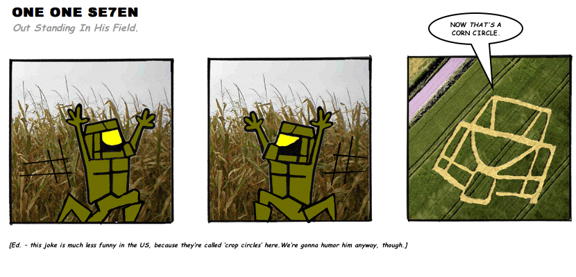 On April 30, 2003, Stuntmutt began turning in episodes of a new comic known as One One Se7en. We'll present them here, in the order in which they were submitted, as they come in. New submissions were added Monday, Wednesday, and Friday. On March 3, 2008, One One Se7en was retired from regular releases - Stunt's life got a tad too busy for 3 strips per week. (He still comes by with new content when the situation arises, however.)