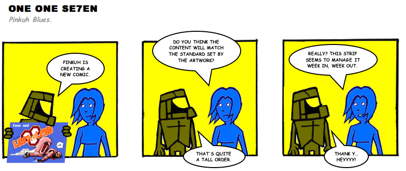 On April 30, 2003, Stuntmutt began turning in episodes of a new comic known as One One Se7en. We'll present them here, in the order in which they were submitted, as they come in. New submissions were added Monday, Wednesday, and Friday. On March 3, 2008, One One Se7en was retired from regular releases - Stunt's life got a tad too busy for 3 strips per week. (He still comes by with new content when the situation arises, however.)