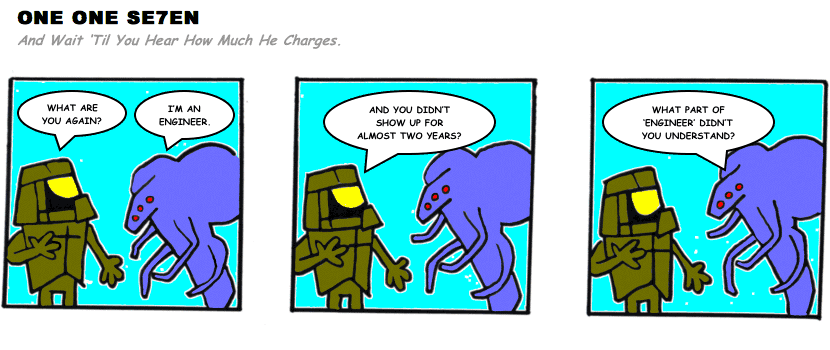On April 30, 2003, Stuntmutt began turning in episodes of a new comic known as One One Se7en. We'll present them here, in the order in which they were submitted, as they come in. New submissions were added Monday, Wednesday, and Friday. On March 3, 2008, One One Se7en was retired from regular releases - Stunt's life got a tad too busy for 3 strips per week. (He still comes by with new content when the situation arises, however.)