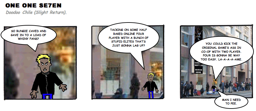 On April 30, 2003, Stuntmutt began turning in episodes of a new comic known as One One Se7en. We'll present them here, in the order in which they were submitted, as they come in. New submissions were added Monday, Wednesday, and Friday. On March 3, 2008, One One Se7en was retired from regular releases - Stunt's life got a tad too busy for 3 strips per week. (He still comes by with new content when the situation arises, however.)
