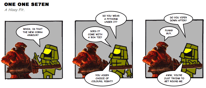 On April 30, 2003, Stuntmutt began turning in episodes of a new comic known as One One Se7en. We'll present them here, in the order in which they were submitted, as they come in. New submissions were added Monday, Wednesday, and Friday. On March 3, 2008, One One Se7en was retired from regular releases - Stunt's life got a tad too busy for 3 strips per week. (He still comes by with new content when the situation arises, however.)
