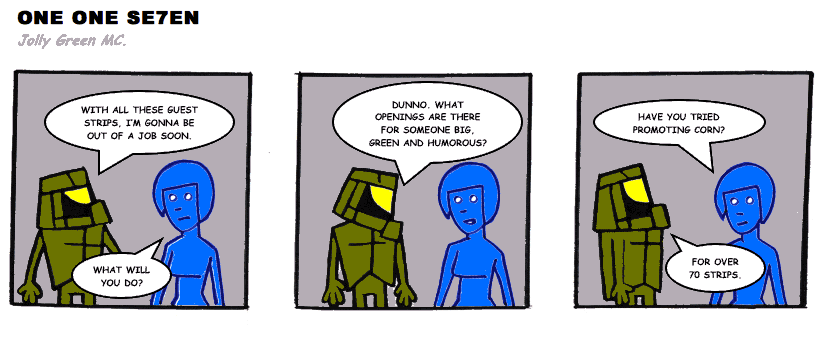 On April 30, 2003, Stuntmutt began turning in episodes of a new comic known as One One Se7en. We'll present them here, in the order in which they were submitted, as they come in. New submissions were added Monday, Wednesday, and Friday. On March 3, 2008, One One Se7en was retired from regular releases - Stunt's life got a tad too busy for 3 strips per week. (He still comes by with new content when the situation arises, however.)