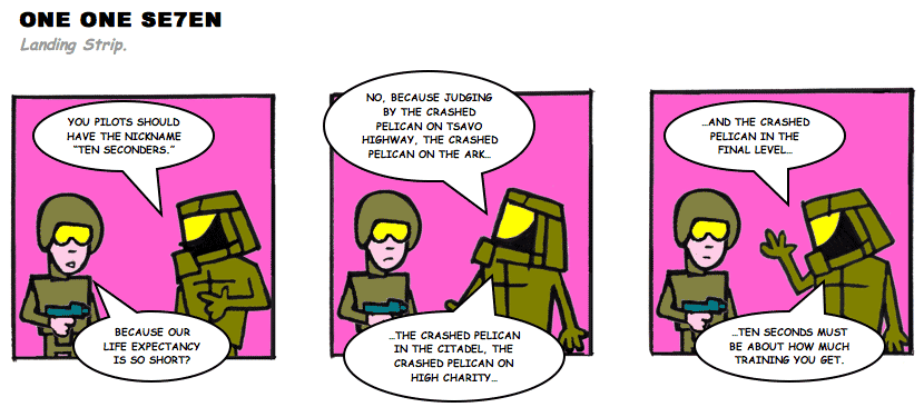 On April 30, 2003, Stuntmutt began turning in episodes of a new comic known as One One Se7en. We'll present them here, in the order in which they were submitted, as they come in. New submissions were added Monday, Wednesday, and Friday. On March 3, 2008, One One Se7en was retired from regular releases - Stunt's life got a tad too busy for 3 strips per week. (He still comes by with new content when the situation arises, however.)