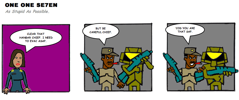 On April 30, 2003, Stuntmutt began turning in episodes of a new comic known as One One Se7en. We'll present them here, in the order in which they were submitted, as they come in. New submissions were added Monday, Wednesday, and Friday. On March 3, 2008, One One Se7en was retired from regular releases - Stunt's life got a tad too busy for 3 strips per week. (He still comes by with new content when the situation arises, however.)