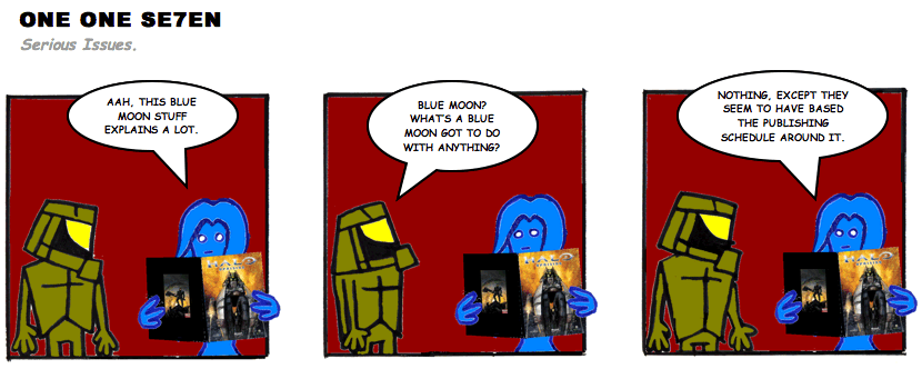 On April 30, 2003, Stuntmutt began turning in episodes of a new comic known as One One Se7en. We'll present them here, in the order in which they were submitted, as they come in. New submissions were added Monday, Wednesday, and Friday. On March 3, 2008, One One Se7en was retired from regular releases - Stunt's life got a tad too busy for 3 strips per week. (He still comes by with new content when the situation arises, however.)