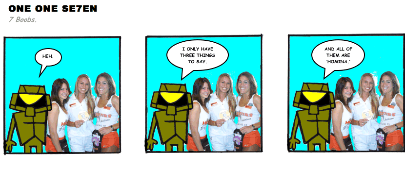 On April 30, 2003, Stuntmutt began turning in episodes of a new comic known as One One Se7en. We'll present them here, in the order in which they were submitted, as they come in. New submissions were added Monday, Wednesday, and Friday. On March 3, 2008, One One Se7en was retired from regular releases - Stunt's life got a tad too busy for 3 strips per week. (He still comes by with new content when the situation arises, however.)