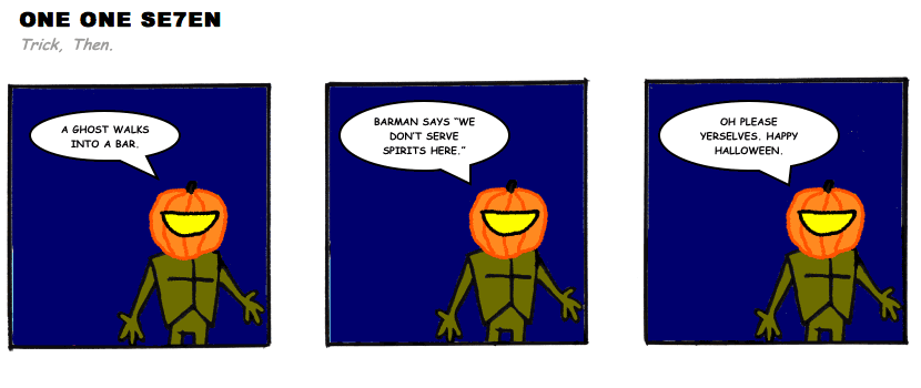 On April 30, 2003, Stuntmutt began turning in episodes of a new comic known as One One Se7en. We'll present them here, in the order in which they were submitted, as they come in. New submissions were added Monday, Wednesday, and Friday. On March 3, 2008, One One Se7en was retired from regular releases - Stunt's life got a tad too busy for 3 strips per week. (He still comes by with new content when the situation arises, however.)