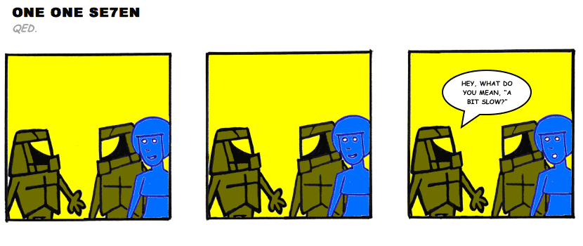 On April 30, 2003, Stuntmutt began turning in episodes of a new comic known as One One Se7en. We'll present them here, in the order in which they were submitted, as they come in. New submissions were added Monday, Wednesday, and Friday. On March 3, 2008, One One Se7en was retired from regular releases - Stunt's life got a tad too busy for 3 strips per week. (He still comes by with new content when the situation arises, however.)