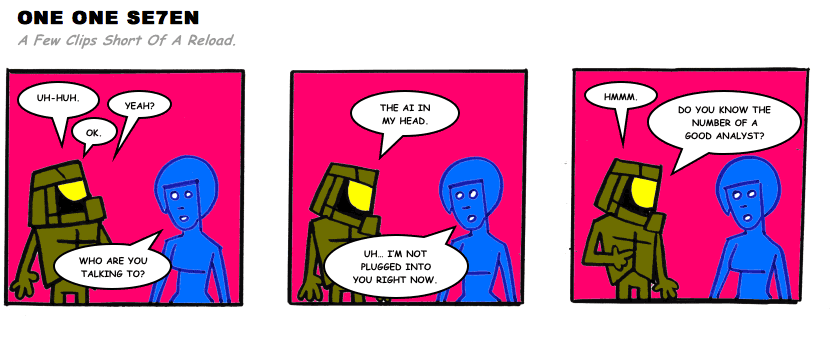 On April 30, 2003, Stuntmutt began turning in episodes of a new comic known as One One Se7en. We'll present them here, in the order in which they were submitted, as they come in. New submissions were added Monday, Wednesday, and Friday. On March 3, 2008, One One Se7en was retired from regular releases - Stunt's life got a tad too busy for 3 strips per week. (He still comes by with new content when the situation arises, however.)