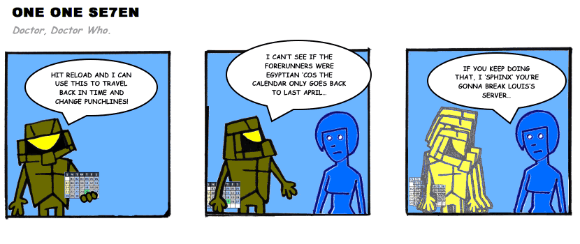 On April 30, 2003, Stuntmutt began turning in episodes of a new comic known as One One Se7en. We'll present them here, in the order in which they were submitted, as they come in. New submissions were added Monday, Wednesday, and Friday. On March 3, 2008, One One Se7en was retired from regular releases - Stunt's life got a tad too busy for 3 strips per week. (He still comes by with new content when the situation arises, however.)