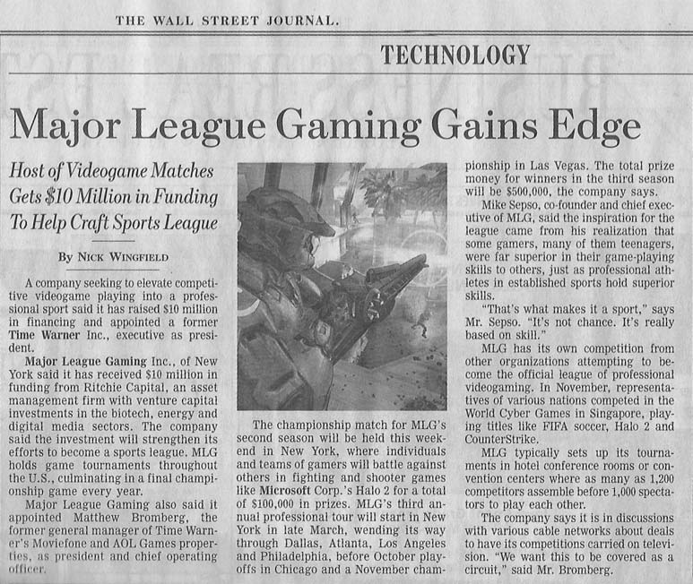 February 23, 2006 Link to this post MLG Hits the Big Time Big news over at MLGPro.com; looks like they secured $10 Million in funding for the 2006 season, and picked up a new President/CEO - Matthew Bromberg, formerly general manager of Time Warner's Moviefone and AOL Games properties. Not too shabby! This was in today's Wall Street Journal (article will be visible for about a week, or can be viewed as a scan) - thanks, Black Six. In other MLG news, they've put up a summary of the upcoming NYC championships - thanks, 3Suns. (Louis Wu 02:17:38 UTC)