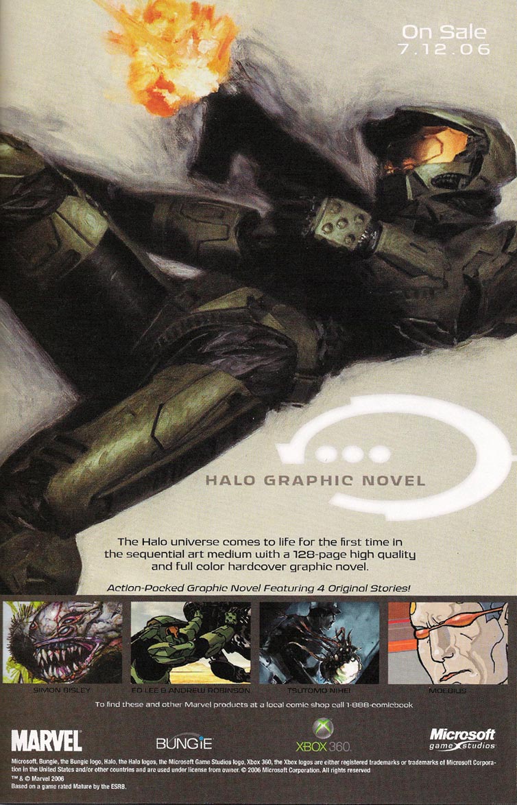 May 9, 2006 Link to this post Marvel's HGN Ad A couple of days ago, Ross Mills pointed out that there was an advertisement for the Halo Graphic Novel in a Marvel product he was looking at. It's a pretty nice ad, with some heretofore unseen pics in it - so we're putting up a copy (189K). I have trouble believing Marvel would have a problem with the free publicity. (Louis Wu 12:25:03 UTC)